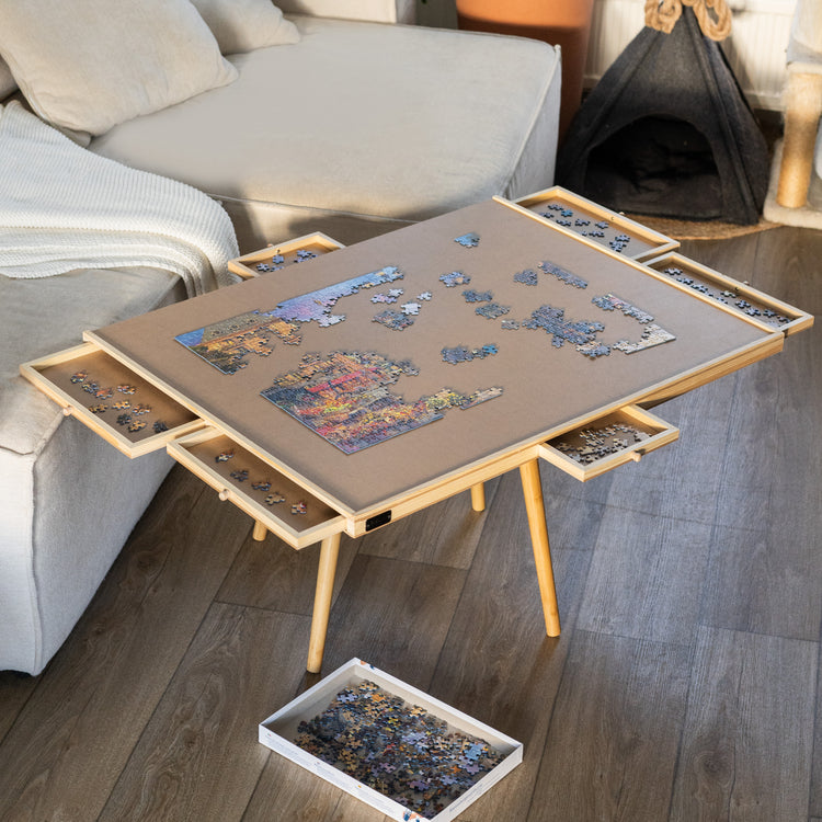 Houten puzzelbord met 6 lades voor puzzels tot 1500 stukjes. Sorteren, opbergen en verplaatsen was nog nooit zo eenvoudig.